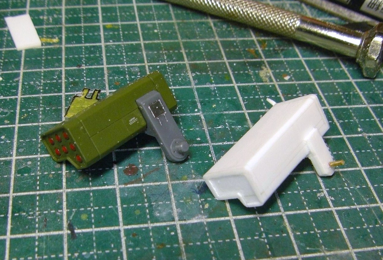 まずはロケット弾ポッドの制作からですが、形状がそっくりなアクティックギアのターボカスタムの物を参考に、プラ板の箱組みで作りました。