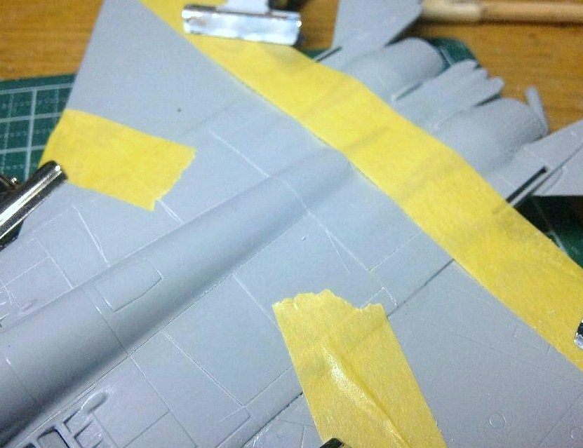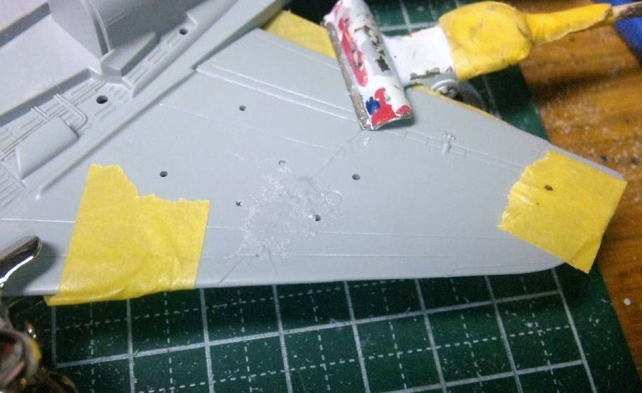 表面処理はいつも通りですが、機首のサイド、レドームの付け根あたりによく目立つ上に消しにくい段差があったので、乾いたところに瞬着を使って埋めました。