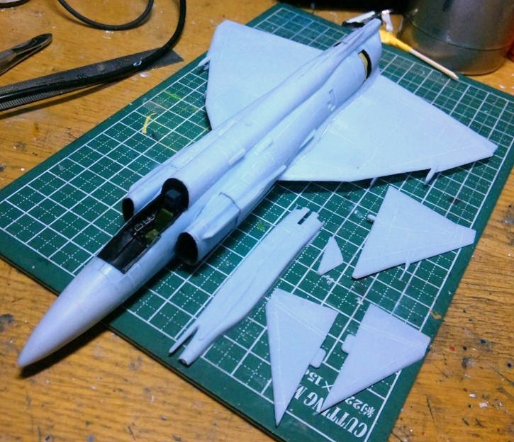 今日はペーパー掛けをするために、全身の凸モールドを全て彫って凹モールドに直したり、翼や機首を取り付けてみました。
