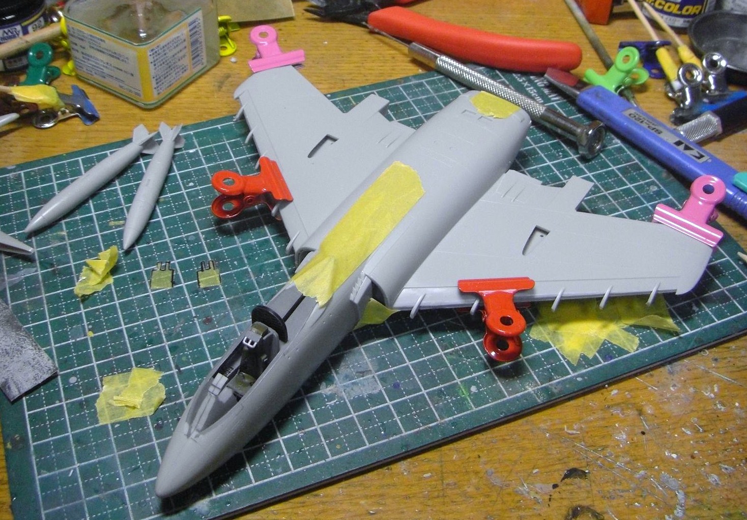 今日は機首と胴体をくっ付けたり、周りの細かいパーツ(増槽やら尾翼やら)の処理などをしました。