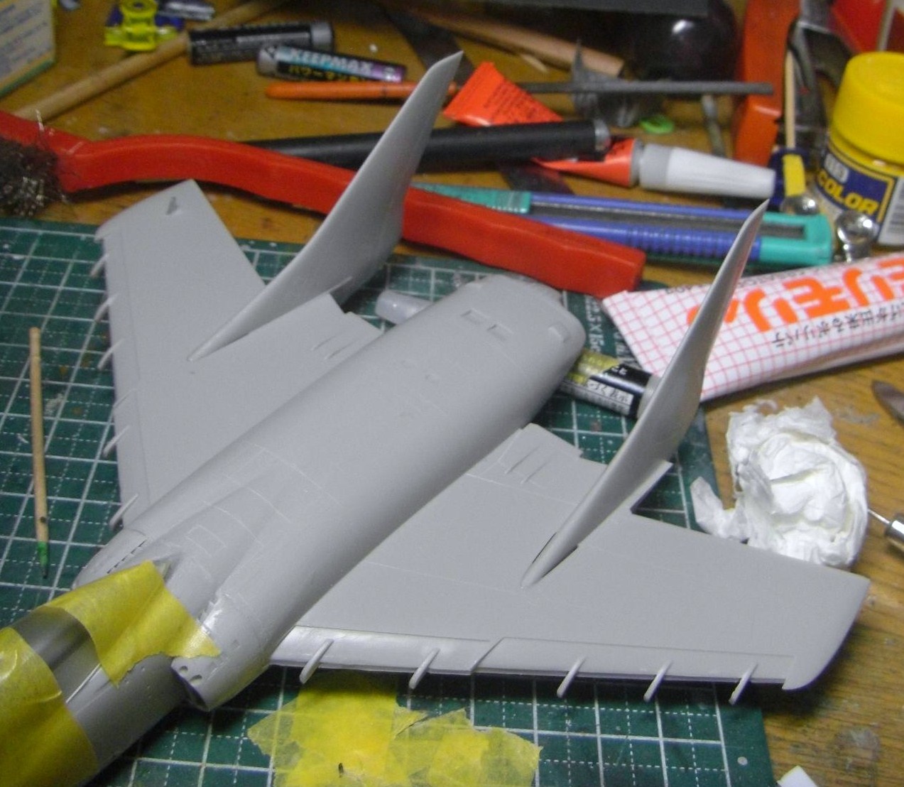 キャノピーに塗ったマスキングゾルが乾くのを待って、垂直尾翼を取り付けます。