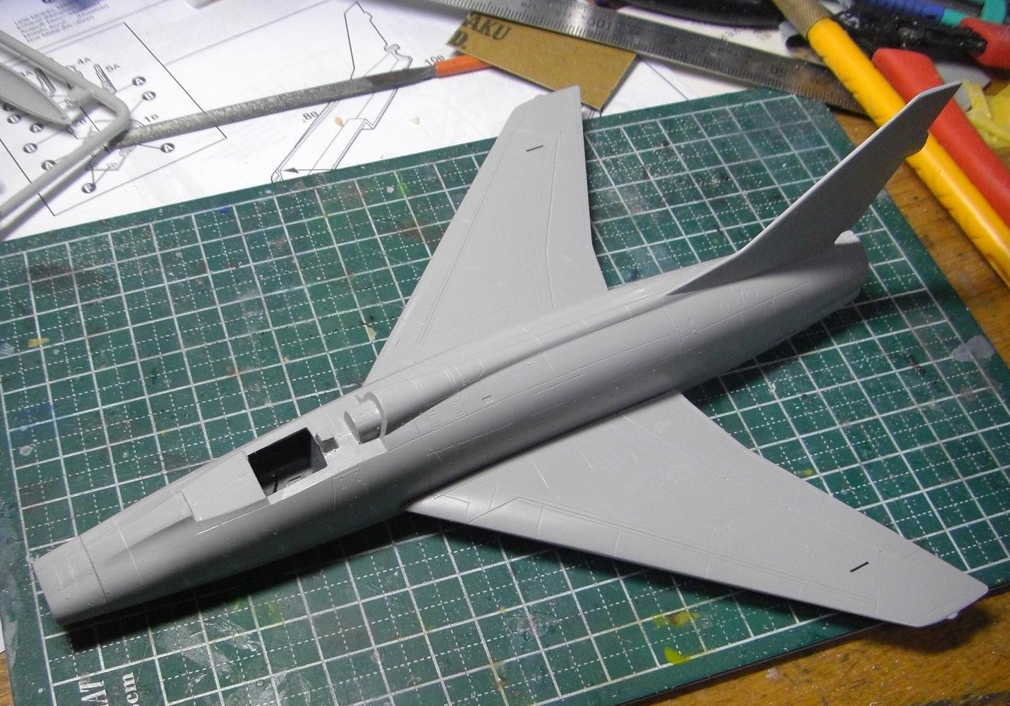 あと、機首の四角く抜けた機関砲部分は合いがイマイチで、瞬着で大まかに固定したのち、つなぎ目にポリパテを盛ろうと考えています。