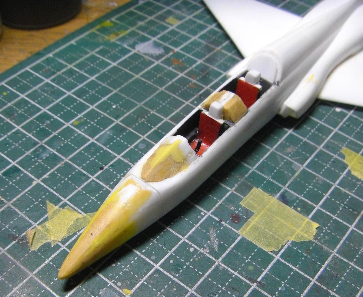キャノピー内側の膨らみをエポパテで再現して、ヘッドレストを作り直し、予定では前席のみコクピットを広げてコンソールを作る予定です。