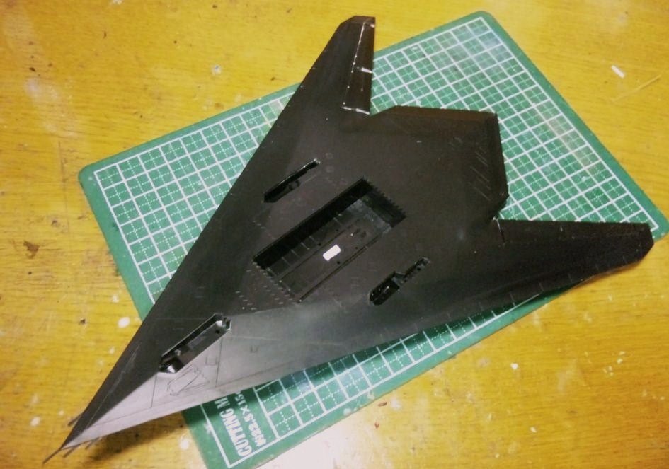 サイズで言えばストライクイーグル並み、面積で言えばそれ以上の大きさを誇るF-117ですが、繋ぎ目の殆ど無いフラットな形状が幸いし、表面処理は至って楽です。