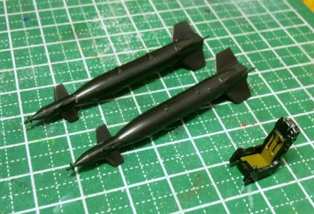で、本キット最大の誤りである爆弾倉のハッチは、1枚成形のハッチパーツを真っ二つにしてから、プラ板で作った仕切り板に接着しました。仕切りは真鍮線で取り外し可能です。