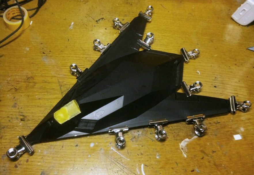 今回は上下2パーツと単純な構造なのですが、何せサイズのやたらと大きいキットなもんですから・・・固定が面倒なので新品の目玉クリップを使いました。