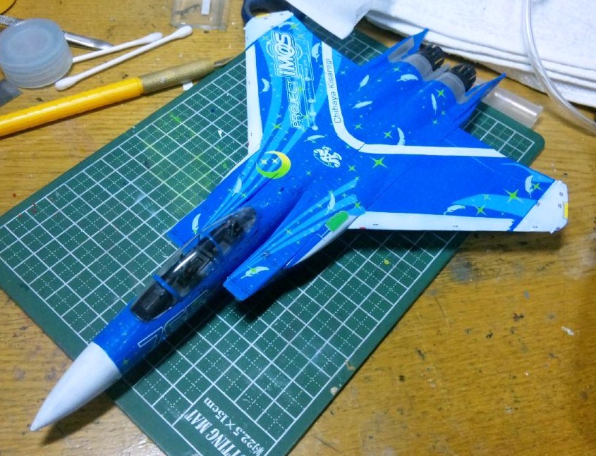本体は一部に塗装をしたのとエンジンを取り付けたのみ。後は翼を取り付けたりデカい千早のデカールを貼ったり・・