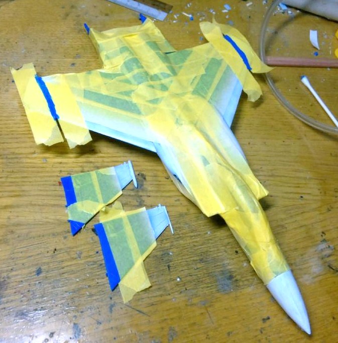 と言う事で、他の白い部分はマスキングしてホワイトで塗る事に。ていうかミラージュを作った時あたりに新しく開けたマスキングテープが今回のエアブラシで一気に無くなっちまいました。束で安く買ってあるからまだいくらでもあるけど・・・