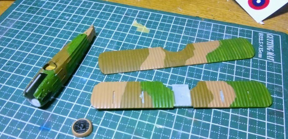 手前の翼で言うと、左端の微妙な茶はタンをベースに、RLM04イエロー、レッド、艦底色などを少量混ぜて表現。