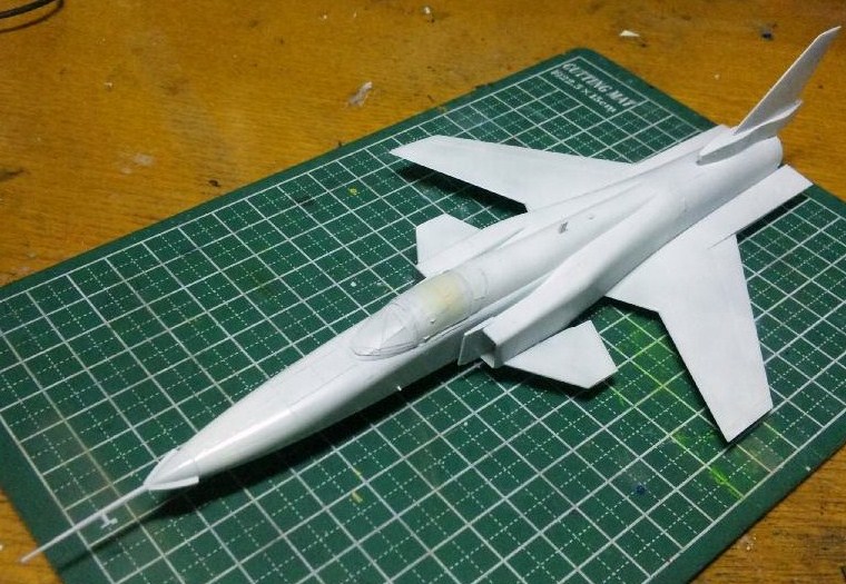 塗装前にインテークとキャノピー、主翼を取り付け、綺麗に磨いてからまずは下地の白を多く混ぜた明灰色を吹きます。どうもサフは慣れないので、こちらで代用するのが最近の主流となりつつあります。