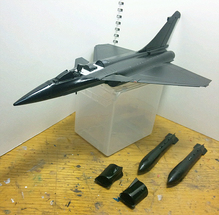ラファールCの方は、エンジン内部の塗装と垂直尾翼・インテーク・増漕の接着をしてました。