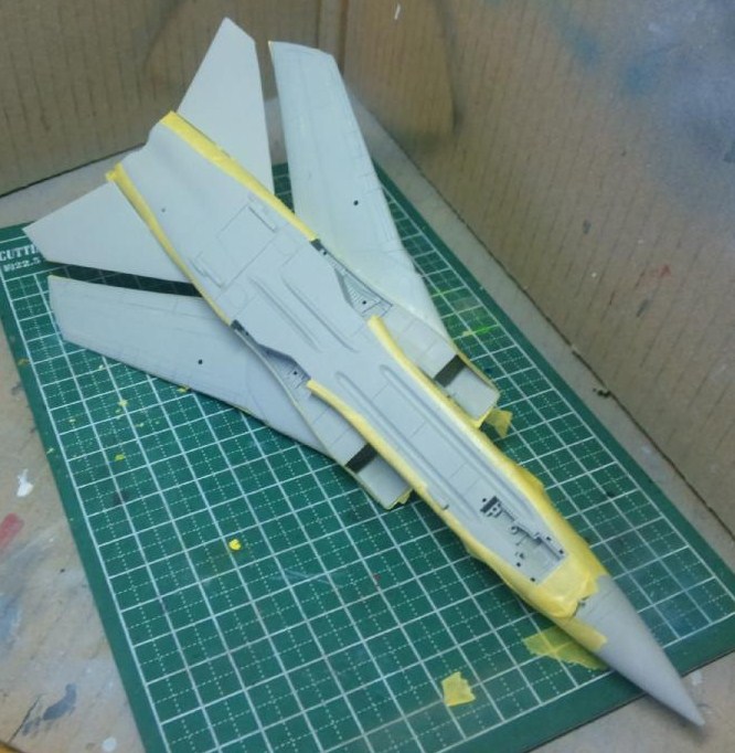まずは本体上面を塗装してから、下面の塗装をするべくマスキングしました。
