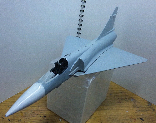 あと他の作業は、塗装前にキャノピーを取り付けたくらいでしょうか。着ける際に瞬着が表面に付いて白くなったので、目の細かい耐水ペーパーで研いでからコンパウンドを粗目・細目の順で研いて対処しました。