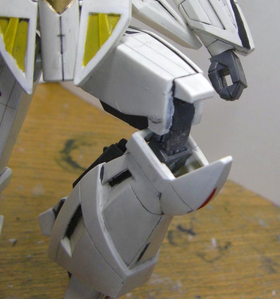 膝は先代と同様、HGインパルスの肩関節を移植しました。なお、太股側のスラスターベーンをより取り外しやすくする、直立時に脚がもっとまっすぐ収まるよう調整するなど、多少進歩した部分もあります。