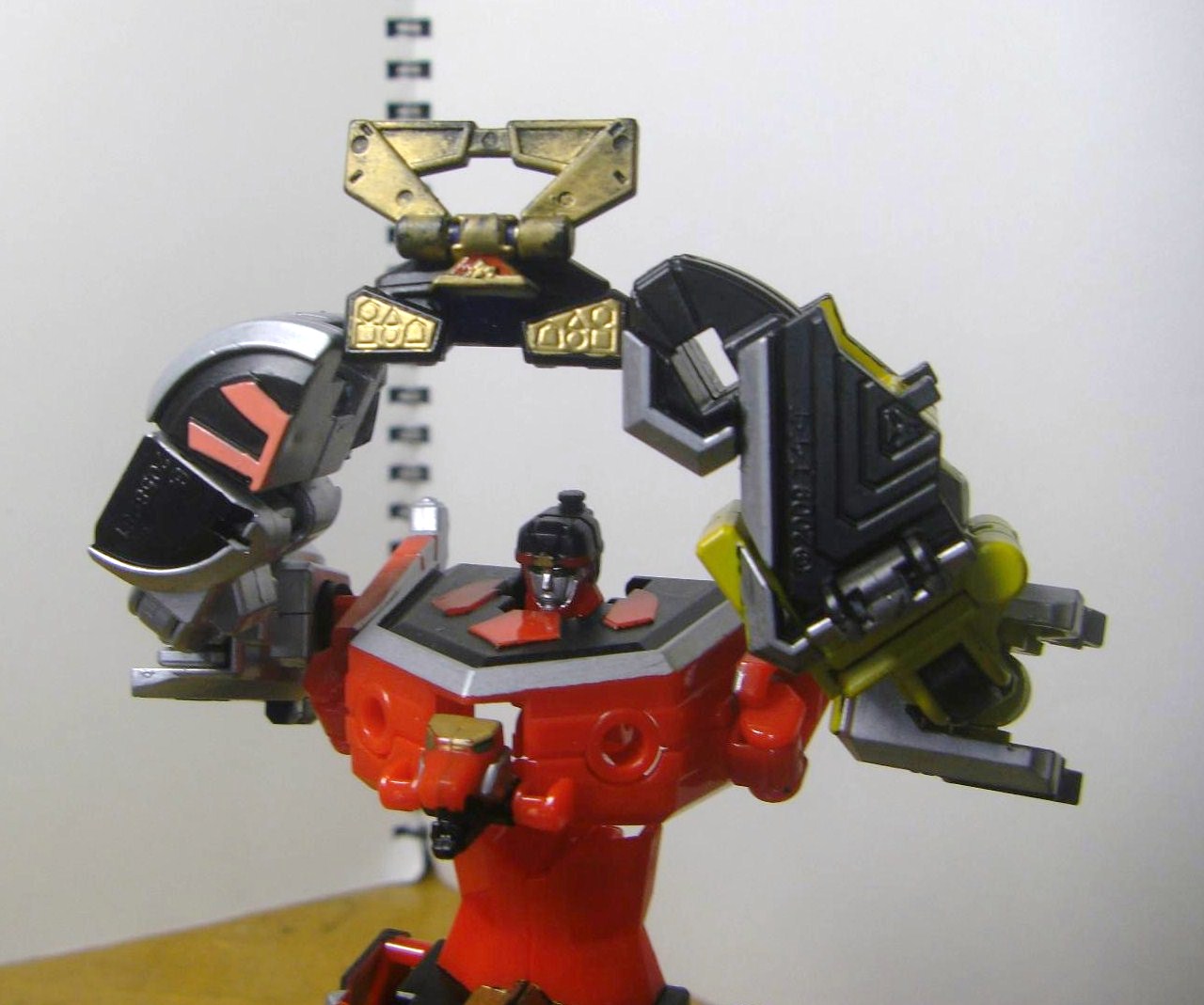 シンケンオーの兜は本物に比べて鍬形の付け根の赤い部分の形が少し違うとか、鍬形の真ん中が繋がっているとか、変形の都合で若干形状が変わっています。