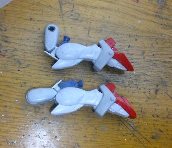 当初膝関節はカバーを別パーツで作っていたのですが、思いの外すり合わせが悪かったので、いつもの太腿のPCと一体化したHG式関節に改めました。こちらの方がカッチリと決まってくれます。