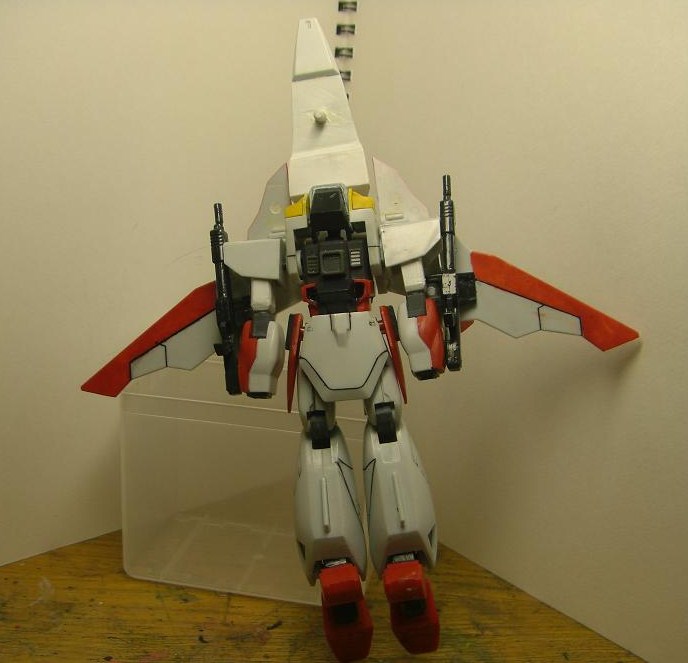 以前のスカスカ感を思わせないくらいの改修はしました。腹にはコトブキヤのバーニアを貼ってありますが、真ん中の大きい奴はかつてMS形態用の拡散ビーム砲という設定でした。しかし、胸ハッチの開閉の都合でボツ設定に・・・という何ともいい加減な状況です(笑)