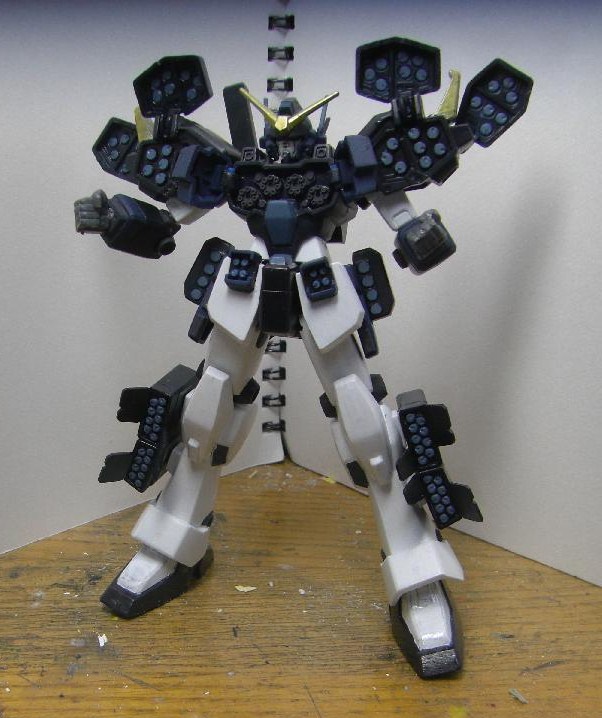 ハッチオープン!全身から100発近いミサイルをぶっ放す豪快な姿です。ちなみにこのキットは、1/100よりミサイルが8発多い(腰フロントアーマーに新規追加されている)という、ちょっとしたトリビアです。