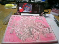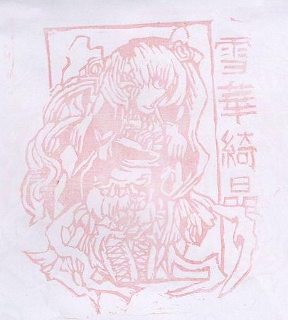 雪華綺晶の消しゴム判子は、最終的な手直しの作業に突入。何度か押したり彫ったりして、なるべく理想の形?%E:221%#ノしていきます。