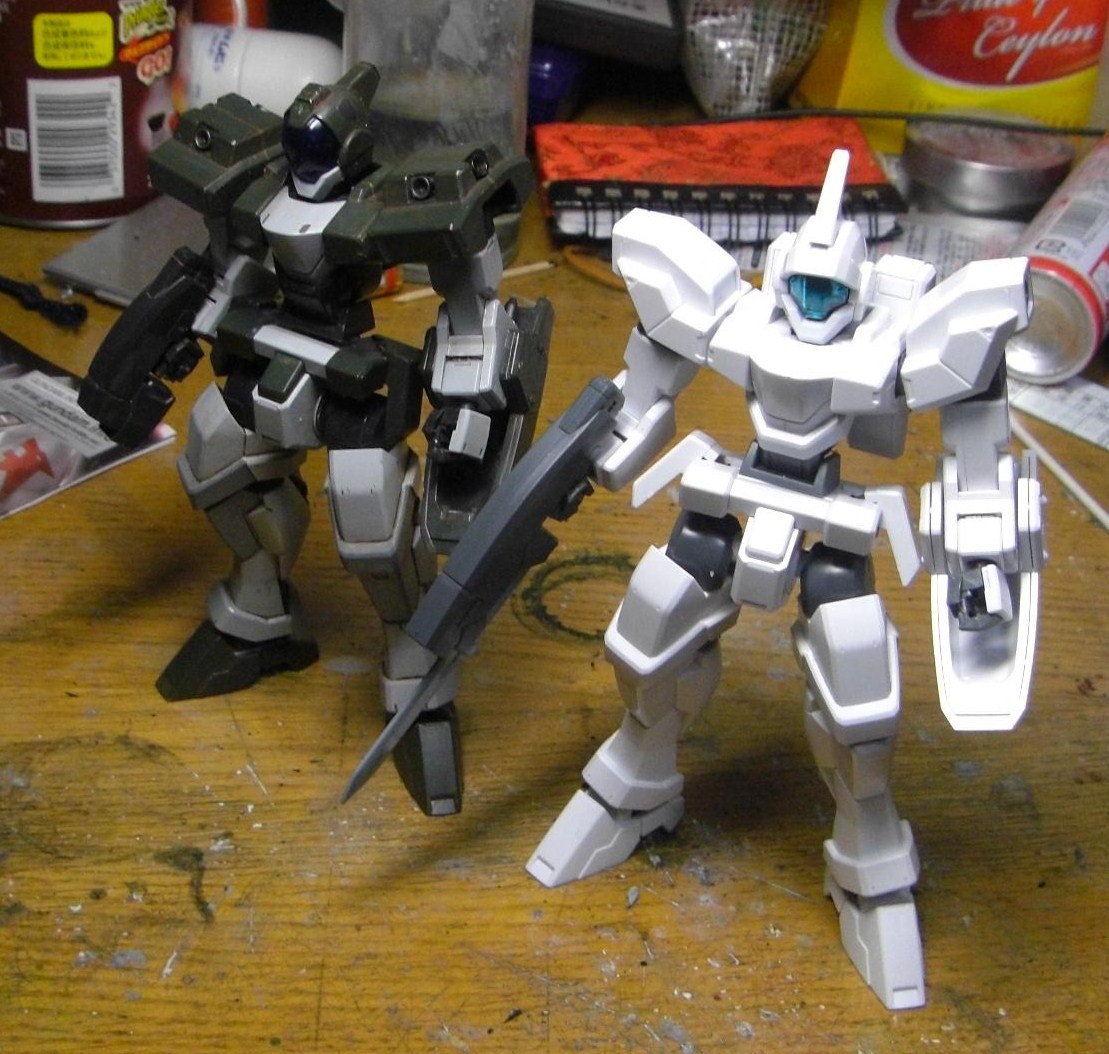 ノーマルジェノアス(グリーンとグレーのロービジ使用ですが・・・)と比較してみると、やっぱりだいぶ印象が変わってますね。ひさしが付いて顔が小さくなったのと、肩の形状が変わった事により、カスタムの方が結構ヒロイックなデザインになりました。