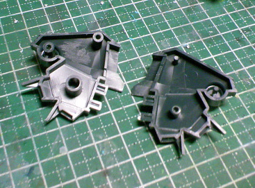 そして、一番後ろの放熱用ダクト(?)の処理ですが、ここはモナカ割りで合わせ目がかなり消しにくい場所なので、フィンを削り落としてから接着しました。