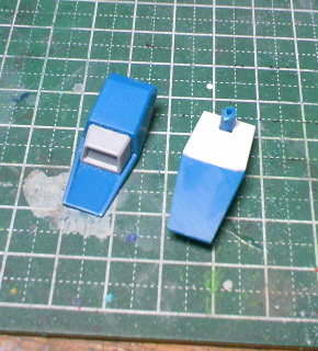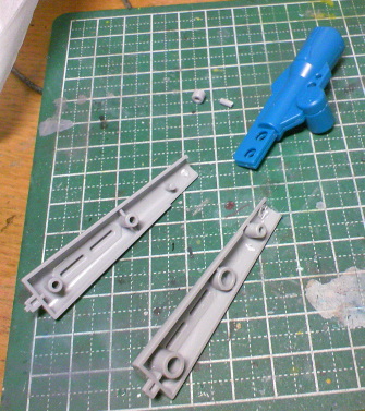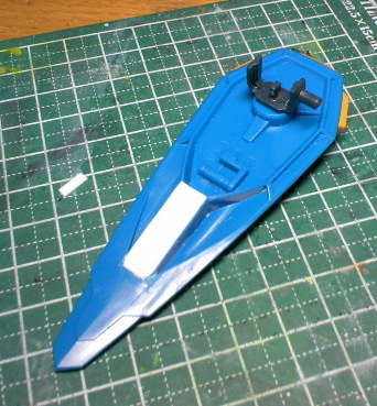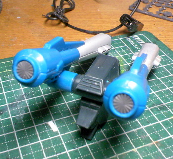 狭い部分ならペーパーでどうにかなるんですが、スラスターはそのまま合わせ目を消してものっぺりしていてビミョーな箇所なので、上からコトブキヤのパーツを貼り付ける事にしました(ふくらはぎにも同じ事をする予定です)