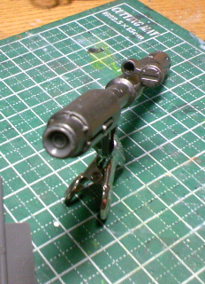 バズーカは割りと手を加えとおり、砲口はコトブキヤのバーニアを貼り付け、尻の方にもパーツを貼ってみたり、スコープの肉抜き穴もプラ板で塞いでしまいました。