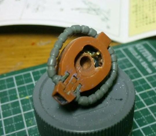 動力パイプの根元部分は取り出せるパーツが無かったので、プラ板を削って製作。最初は固定式だったんですが、思ったよりも可動を阻害するので、2か所に埋めこんだスプリングパイプで可動するように変更しました。