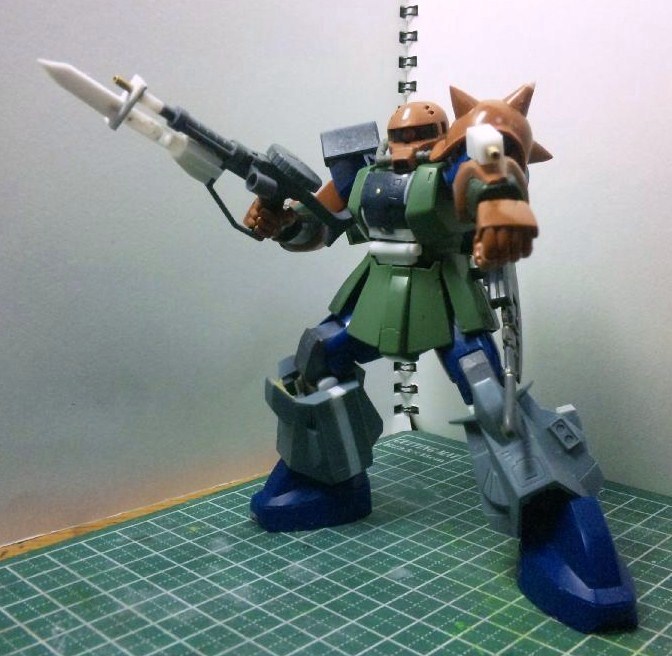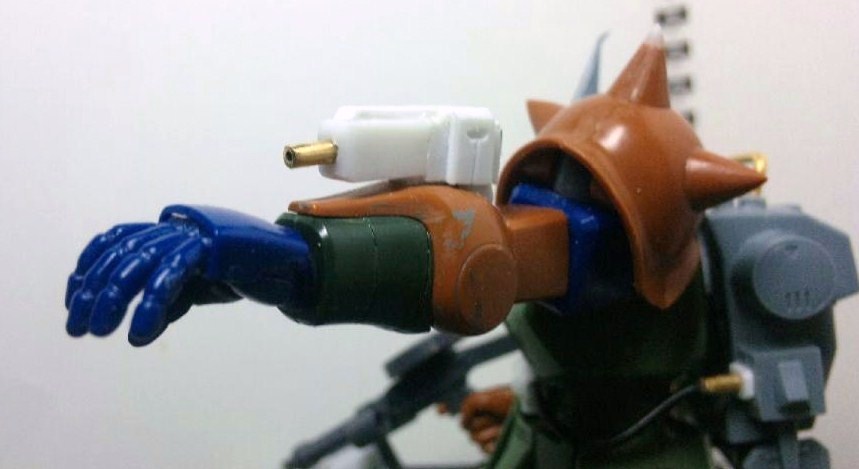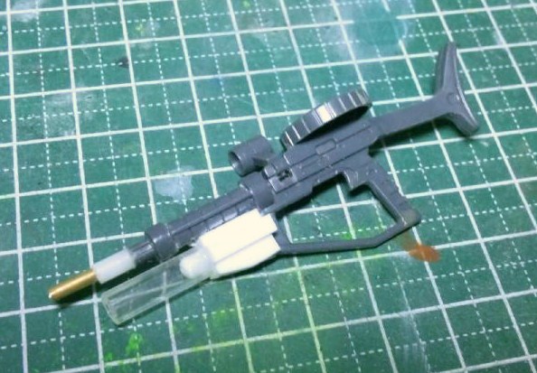 メイン武装のザクマシンガン(例によってガルマザクから)は、グリップと銃口が折れていたので、プラ板・プラ棒・プラパイプ・真鍮パイプで新しい銃口とグレネードランチャーを追加しました。