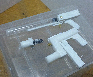 サブマシンガンは単なるおまけ的な物として制作。真鍮パイプの銃口の下の出っ張りはセンサーの積もりで、マガジンは取り外し可能となってます。また、昨日のマシンガンもマガジンを取り外せる様に直しました。
