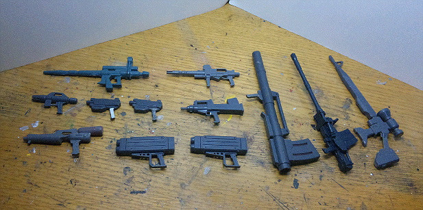 スナイパーカスタムは自作武装の塗装が終了。次はキットから流用した武装類(スプレーガンやら各種ビームライフルやら)の塗装となります。