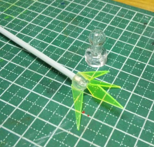 刃はクリア下敷の切れ端をそれっぽく切り出して使用。プラ棒以外は百均の文具・事務用品コーナーで手に入るような物ばかりです。