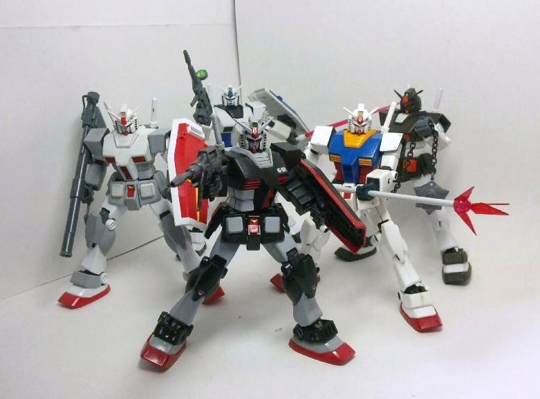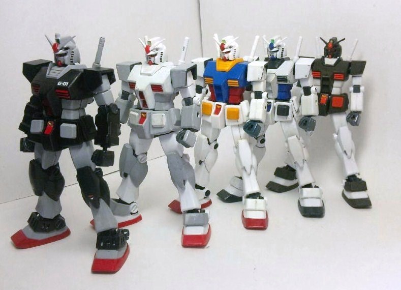 手前からプロトタイプ、ガンダム(ロールアウトカラー)、ガンダム、G-3ガンダム(キットはGアーマー付属のもの)、FAガンダム素体のガンダムとなっています。