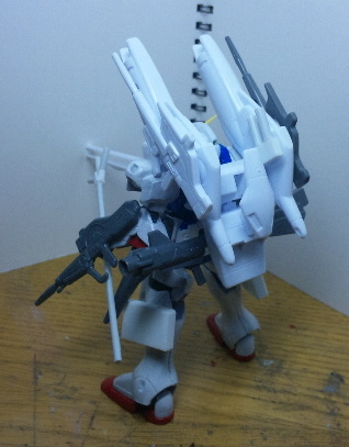でも簡易型と言っても、ただ左オーバーハングキャノンを撤去(というか元から無くなっていた)して変わりにハードポイントを設けただけの簡単な加工です。ちなみにこのハードポイント用にプラ板とプラ棒でマルチランチャーを新造しましたが、別にビームライフルやミサイルポッド等の武装も装着可能です。