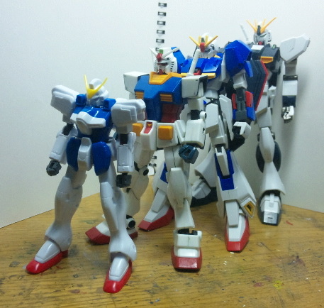 あと余談ですが、ふと思い立ってVをファースト・Z・νと並べてみたら、そのサイズ差に愕然とさせられました。だって同じ1/144なのにVがνの腰までしかないんですもん・・・もしかしたらF91からMSが小型化した本当の理由は、プラモのコストダウンにあったのかもしれませんねぇ。同じ旧キットで比較しても、大したオプションも付いていないνガンダム(フィンファンネル無しVer.)が定価800円、それを思えば如何にVダッシュが安いかおかわりでしょう(あれ?)