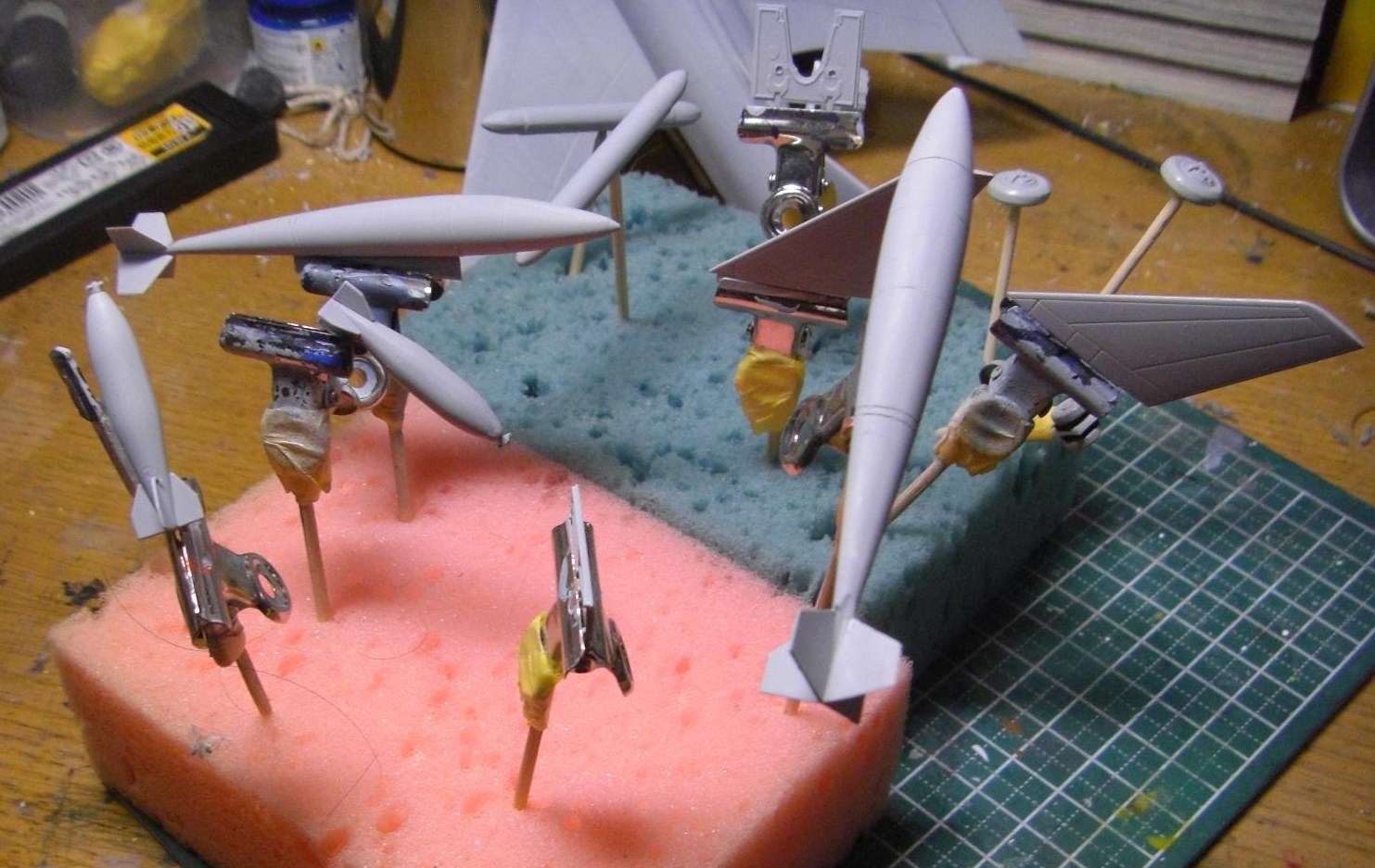 他の部品も持ち手を付けて下地を塗りました。今回はいくつかランナーに付いたままの状態で塗装するので、持ち手をつける分は比較的少なめです。