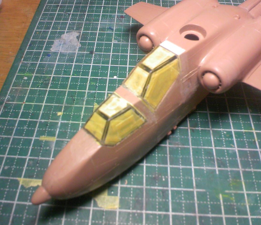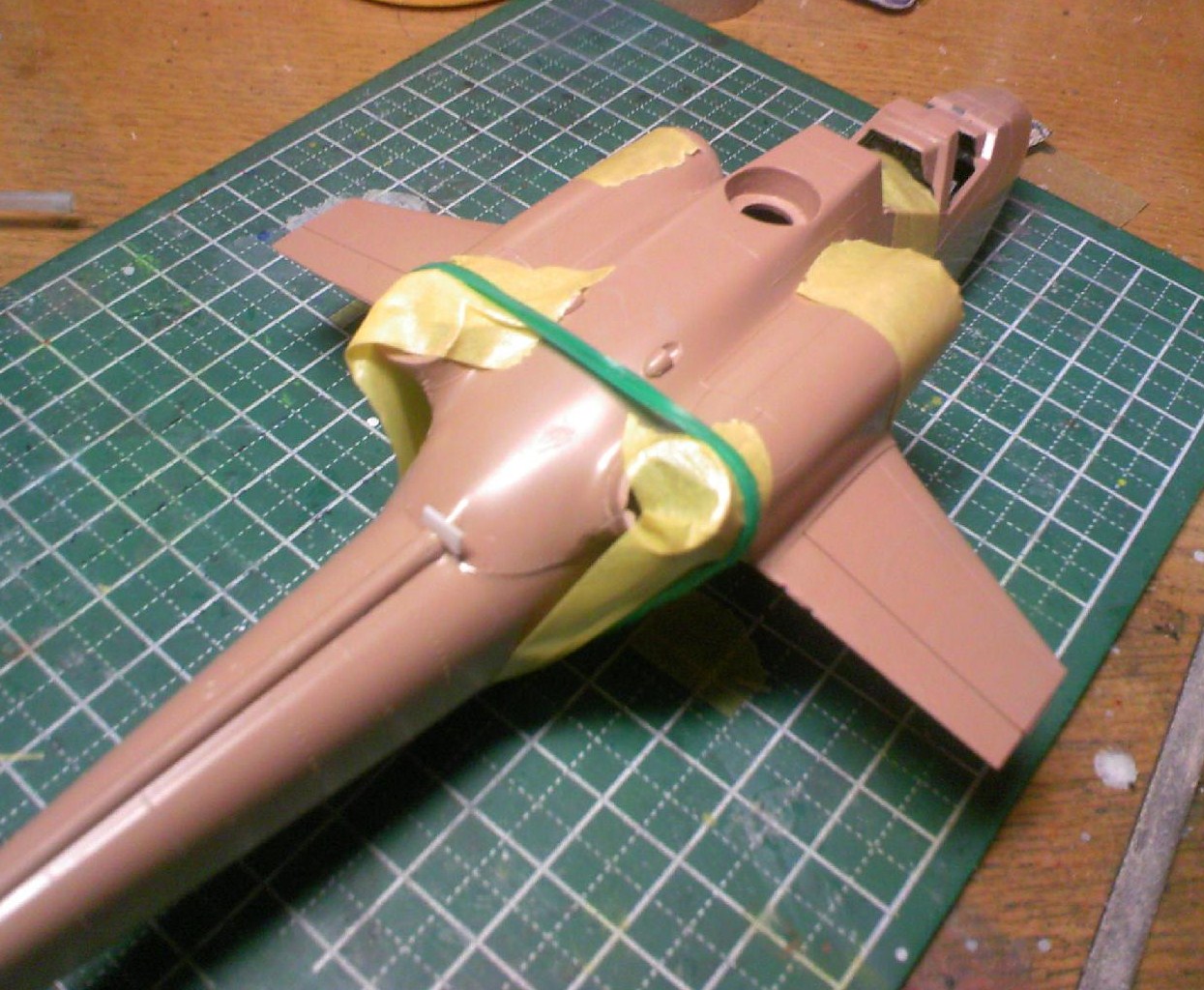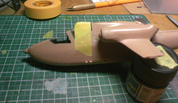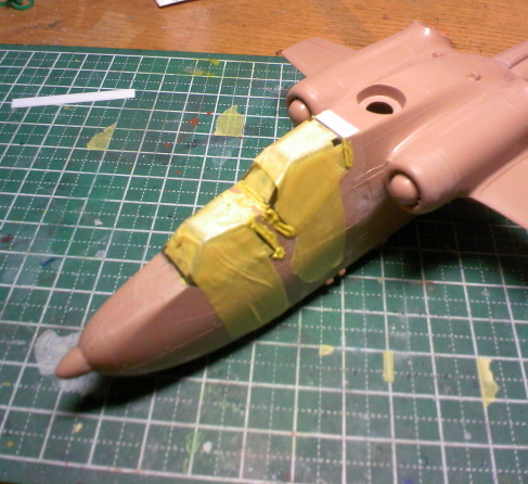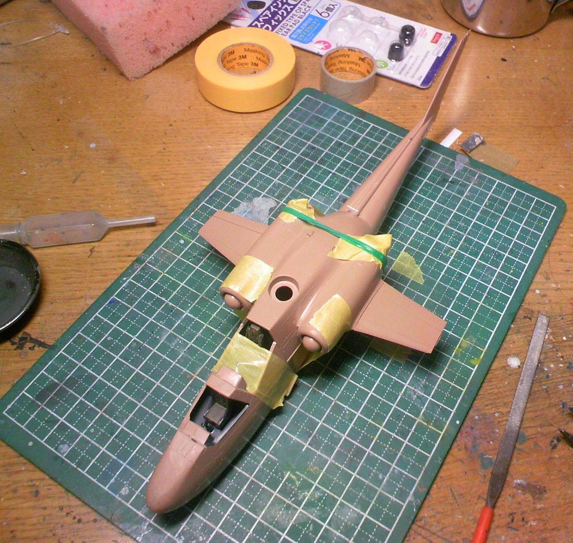 で、それからキャノピーをマスキングし、パーツを接着。上から軽くテープを貼って固定し、気になる隙間にポリパテを盛りました。