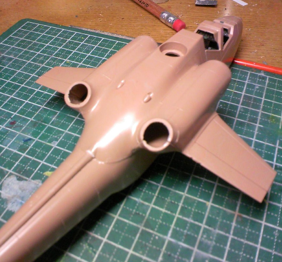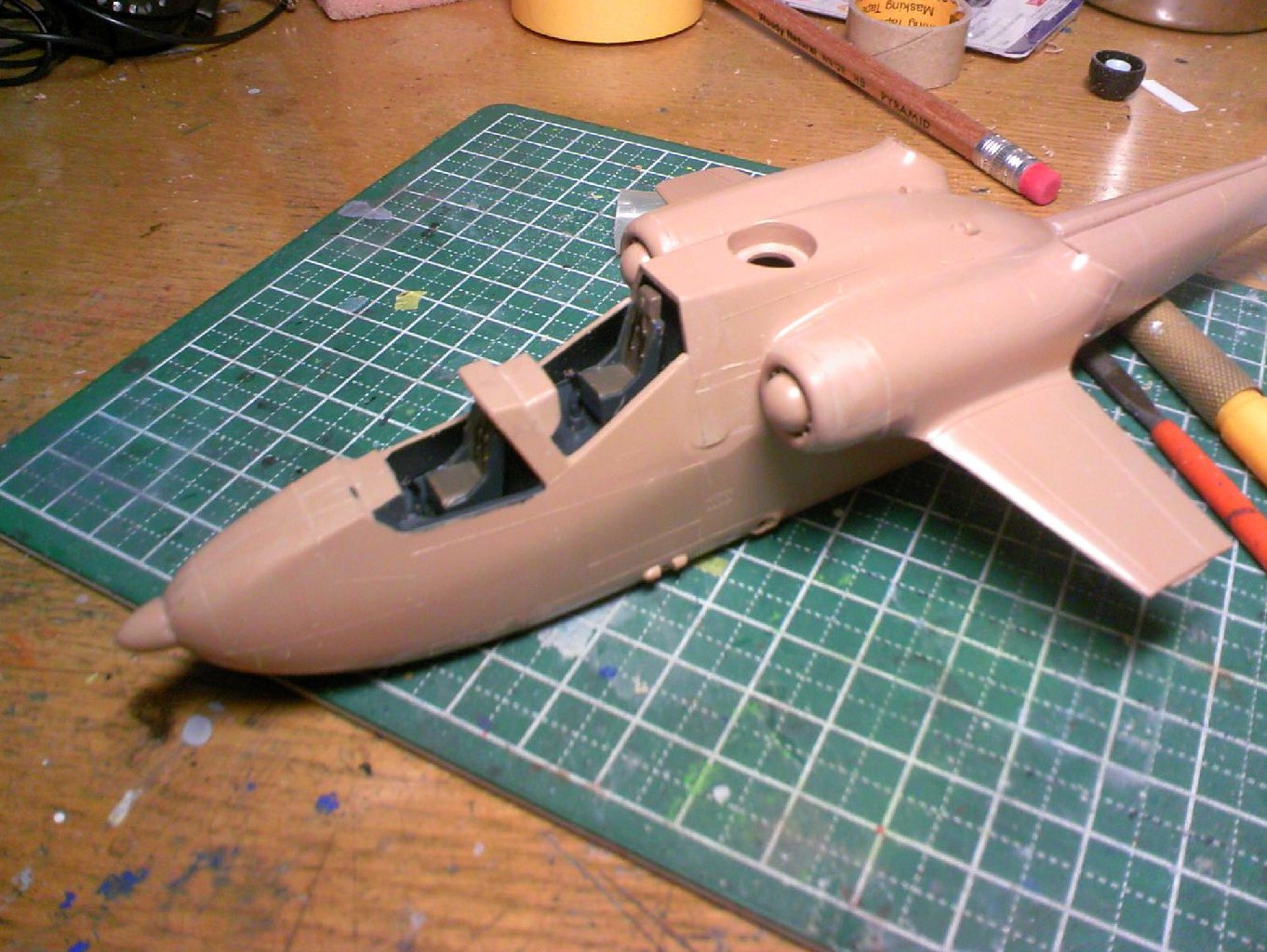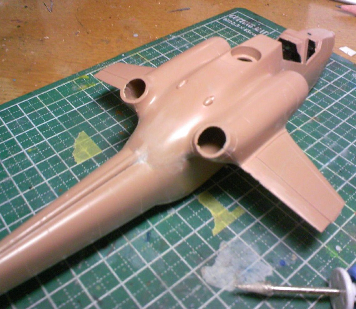 で、それからキャノピーをマスキングし、パーツを接着。上から軽くテープを貼って固定し、気になる隙間にポリパテを盛りました。