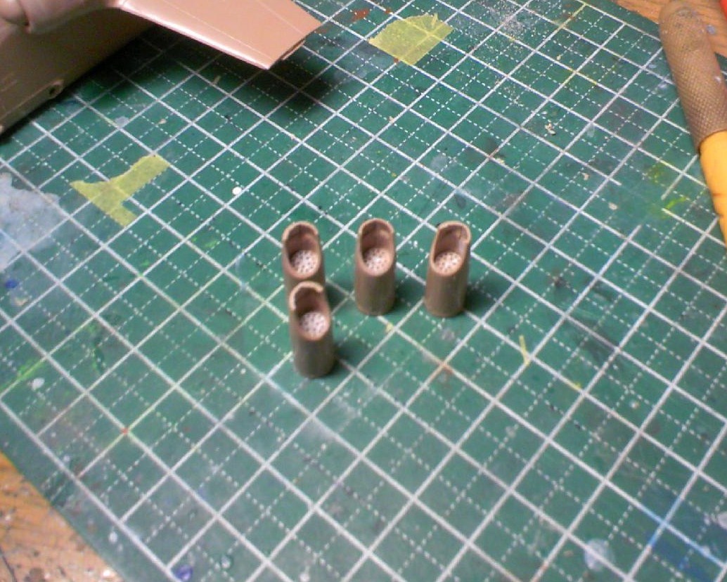 で、ロケット弾ポッドの合わせ目もパパっと処理して、後ろの排気口を取り付けました。直径は合ってないわパーツのストッパーが役立たずだという散々な仕様でしたが(笑)