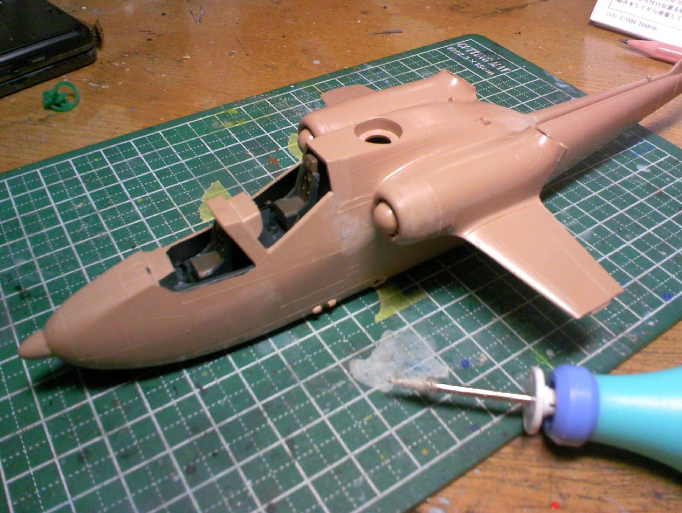 画像はありませんが、まず地道に合わせ目を処理して、それからエンジン部分を接着しました。相変わらず輪ゴムとマスキングテープで無理やり固定しています。