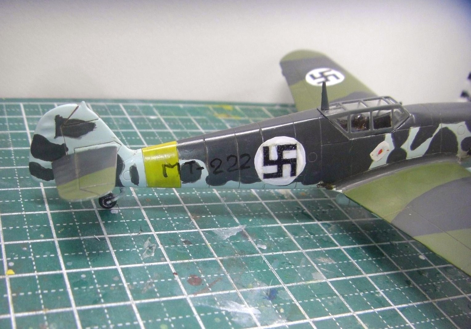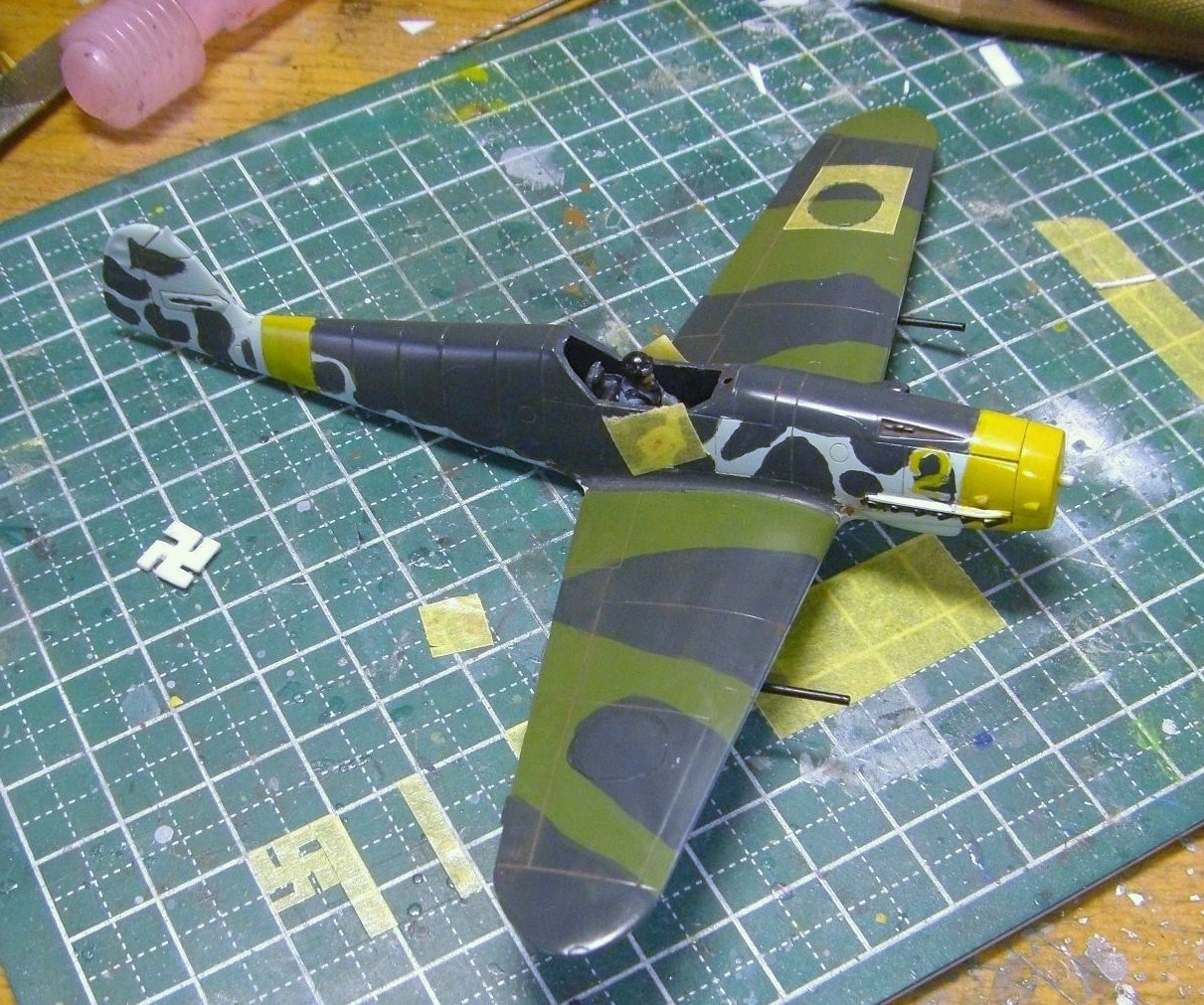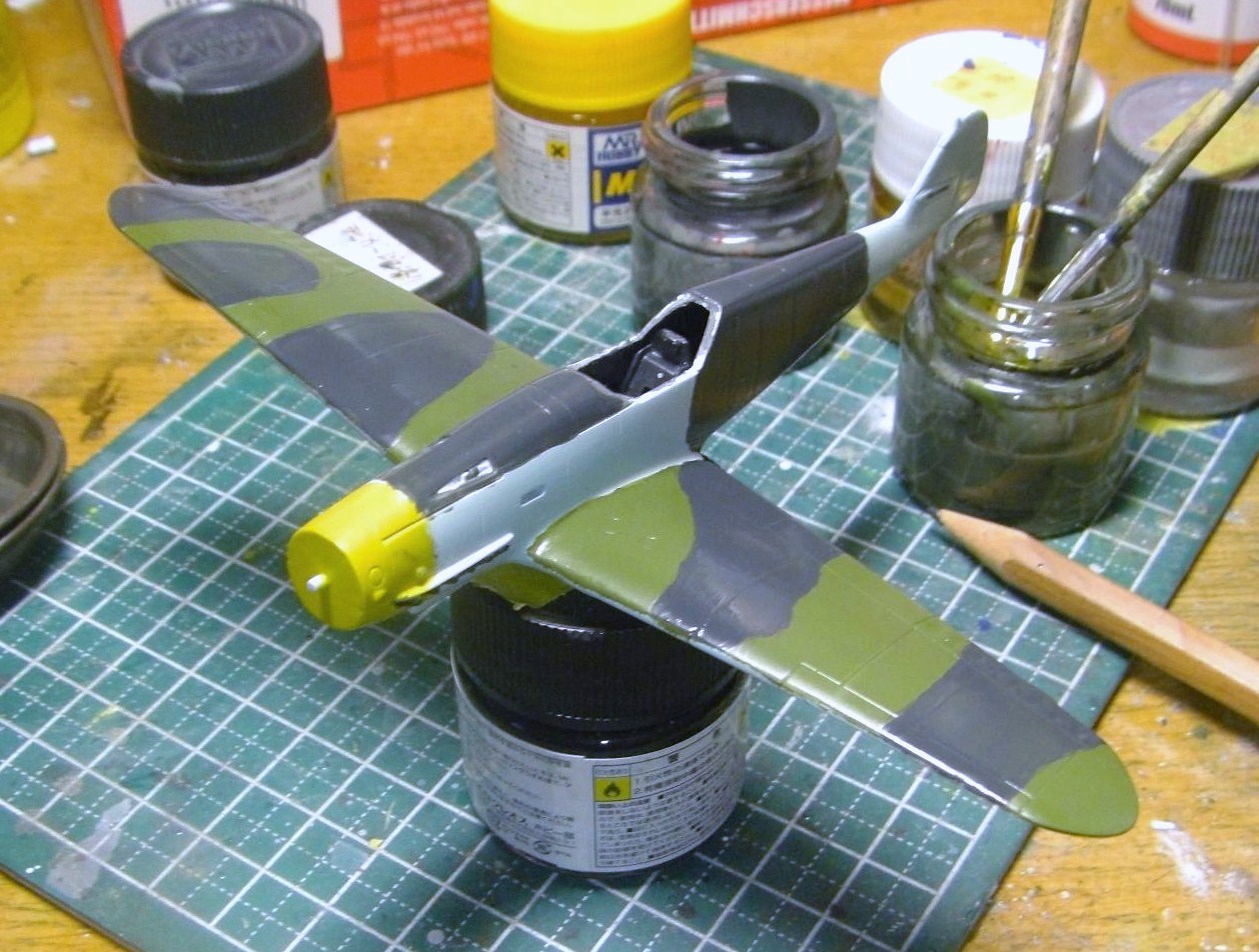 まず胴体に前と同じ要領でライトブルーを、主翼上の全面に作ったグリーンを塗りました。これはグレーバイオレットやRLM04イエロー、ネービーブルーなどを適当に混ぜて作りました。