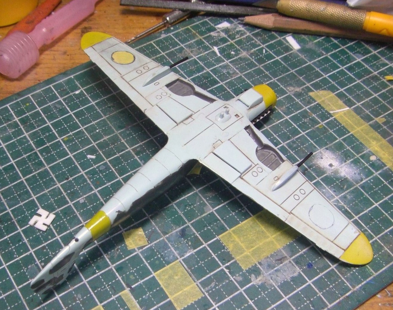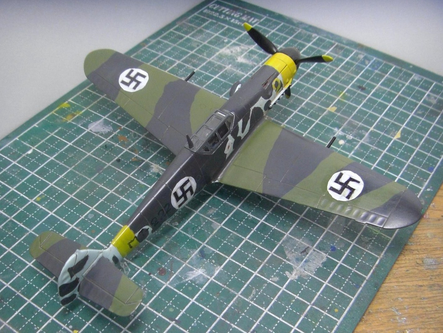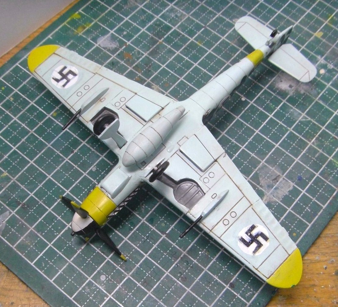 まず胴体に前と同じ要領でライトブルーを、主翼上の全面に作ったグリーンを塗りました。これはグレーバイオレットやRLM04イエロー、ネービーブルーなどを適当に混ぜて作りました。