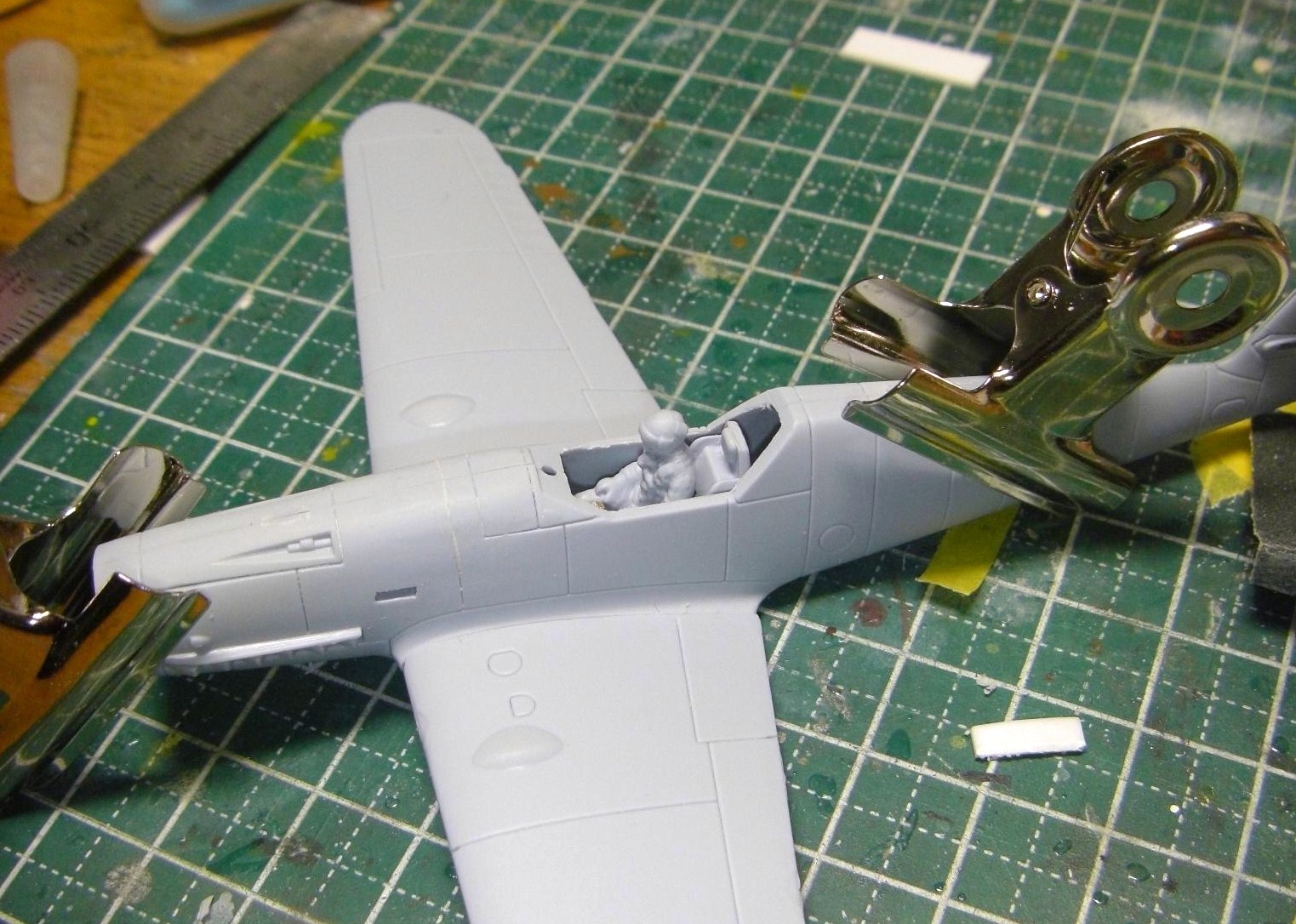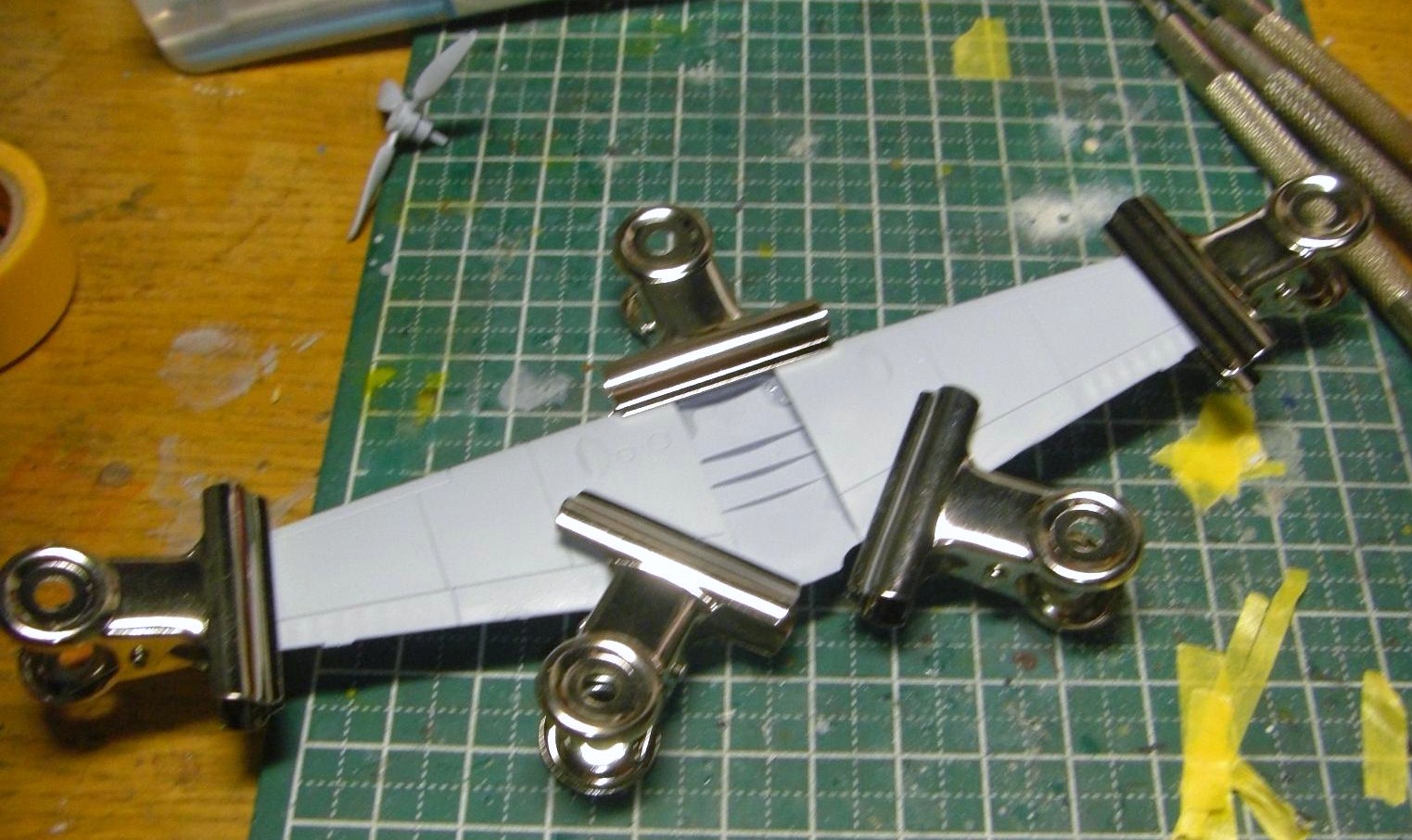 主翼はそのまま接着しました。今回新しくクリップを仕入れてきたんですが、新品のクリップの保持力は中々の物ですね。