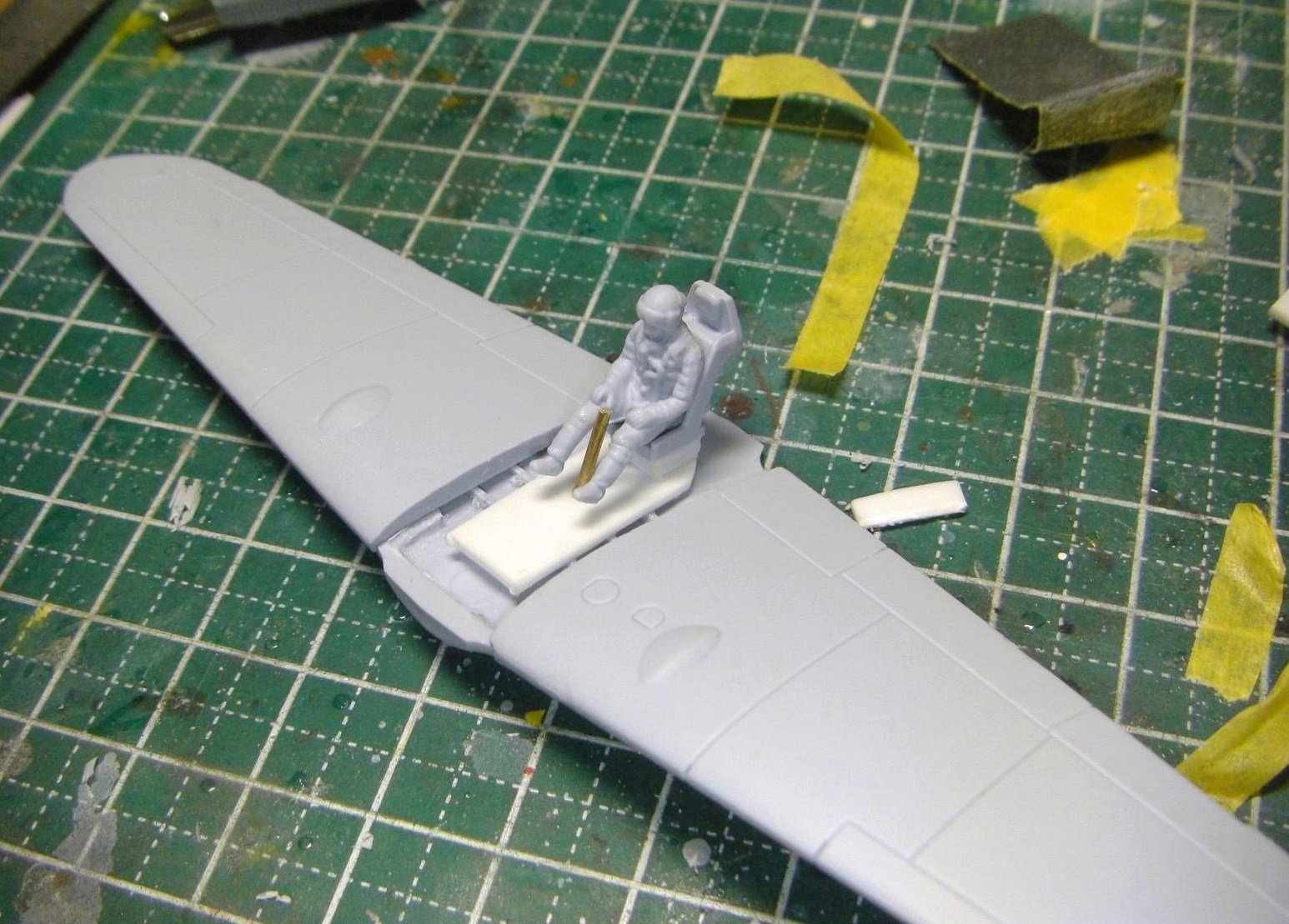 床は主翼ブロックに接着し、座席とイッル(ユーティライネンの愛称)はこちらにくっつけて操縦桿も追加しました。どうせコクピットは狭くてロクに見えないからこの程度でいい、その程度の自己満足で作っています(笑)