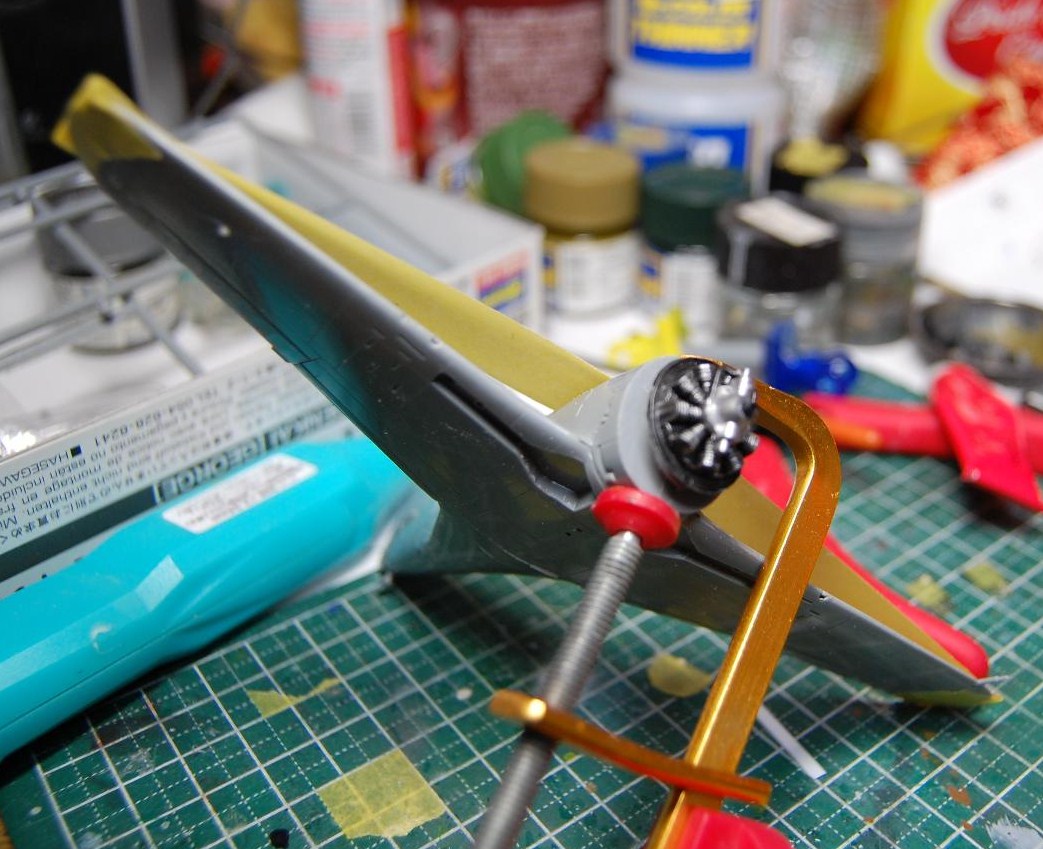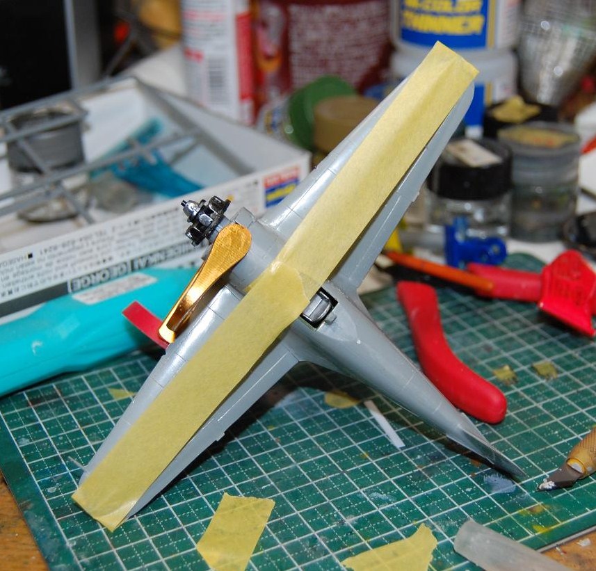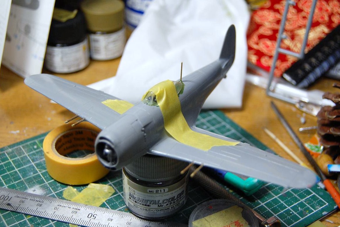 今日はパーツの合わせ目をヤスリがけし、主翼を取りつけました。マスキングテープは翼の固定のために使っています。