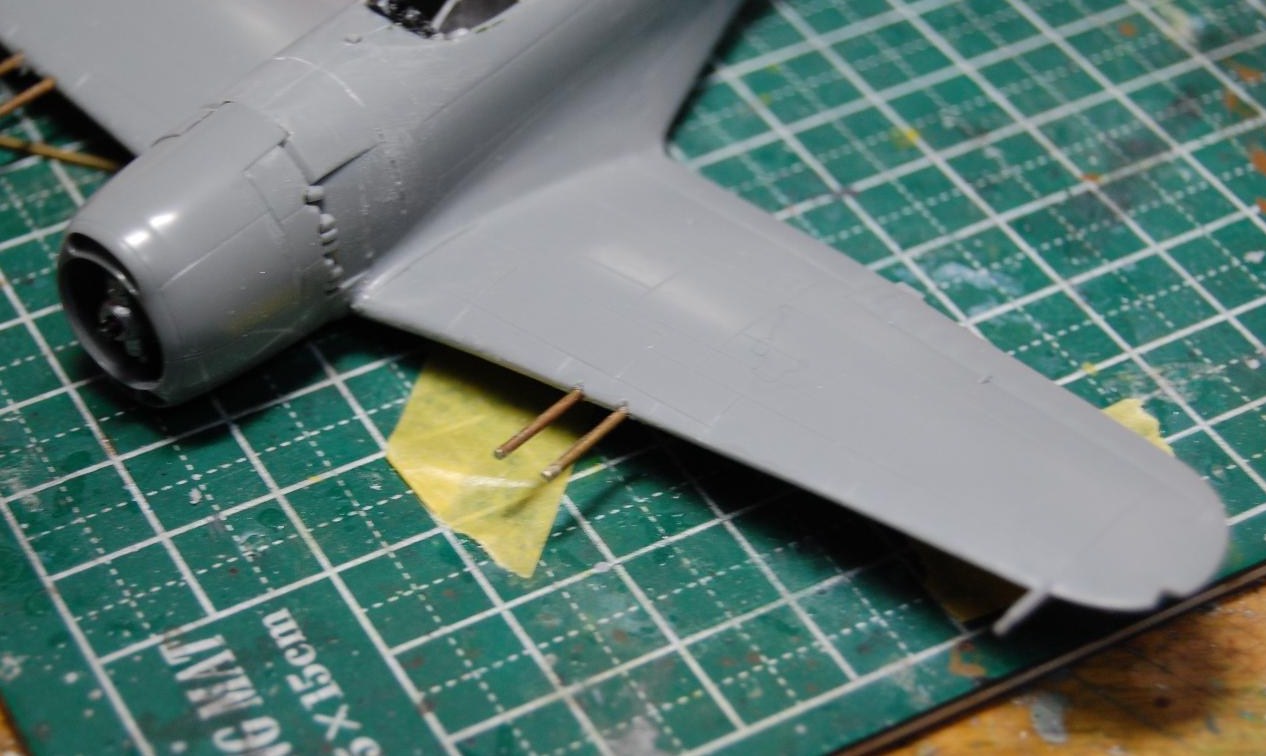 コクピット後方のアンテナ支柱は0.7ミリ真鍮線を板状に削って製作。アンテナ線は・・・やっぱスピットファイアの時と同じく髪の毛使用かな。アレより細く頑丈で材料が多く手に入る素材はありませんからね(笑)