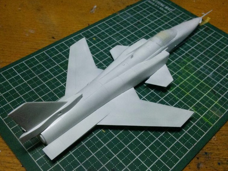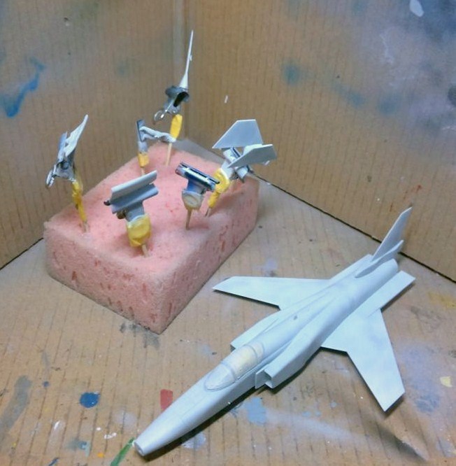 塗装前にインテークとキャノピー、主翼を取り付け、綺麗に磨いてからまずは下地の白を多く混ぜた明灰色を吹きます。どうもサフは慣れないので、こちらで代用するのが最近の主流となりつつあります。