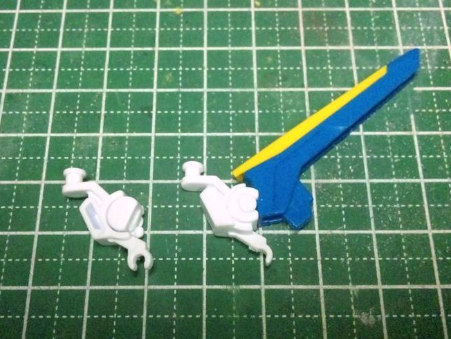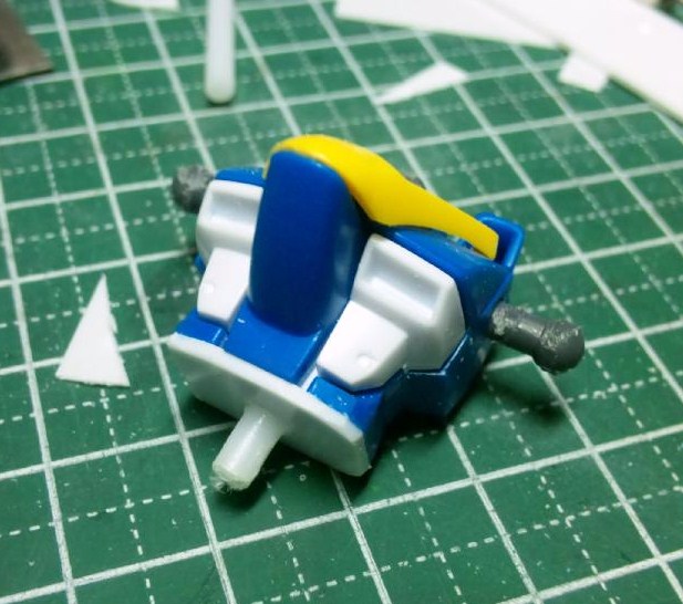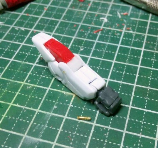 腕のビームシールド発生機は接続ピンが短く、シールドが保持しにくいので、肉抜き穴を埋めた上で接続ピンをより長いプラ棒に変更。