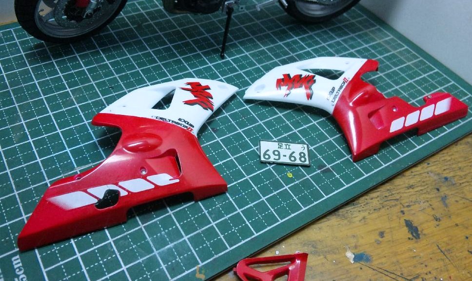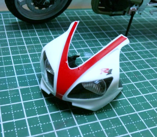 今回最も難儀したアッパーカウル。真ん中の赤いデカールが上手い事貼りついてくれないし、ボルトのディテールのお陰で隙間ができまくり・・・あーだこーだと調整している内にちょっと破けちゃいました。