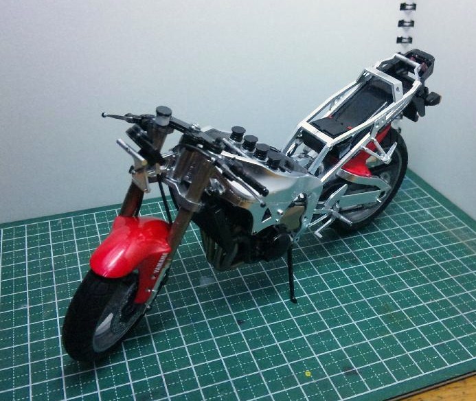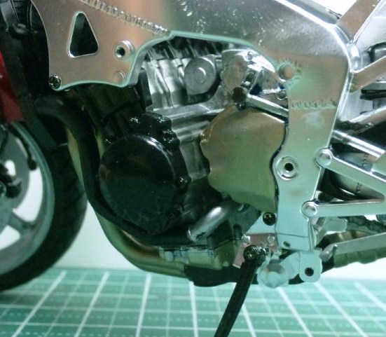 キットの方は、一部ビス留めで後はほぼ接着式。フレームなどのメッキパーツもど真ん中で合わせ目が出るので、その部分だけメッキを落としてからメタルカラーのクロームシルバーを塗りました。